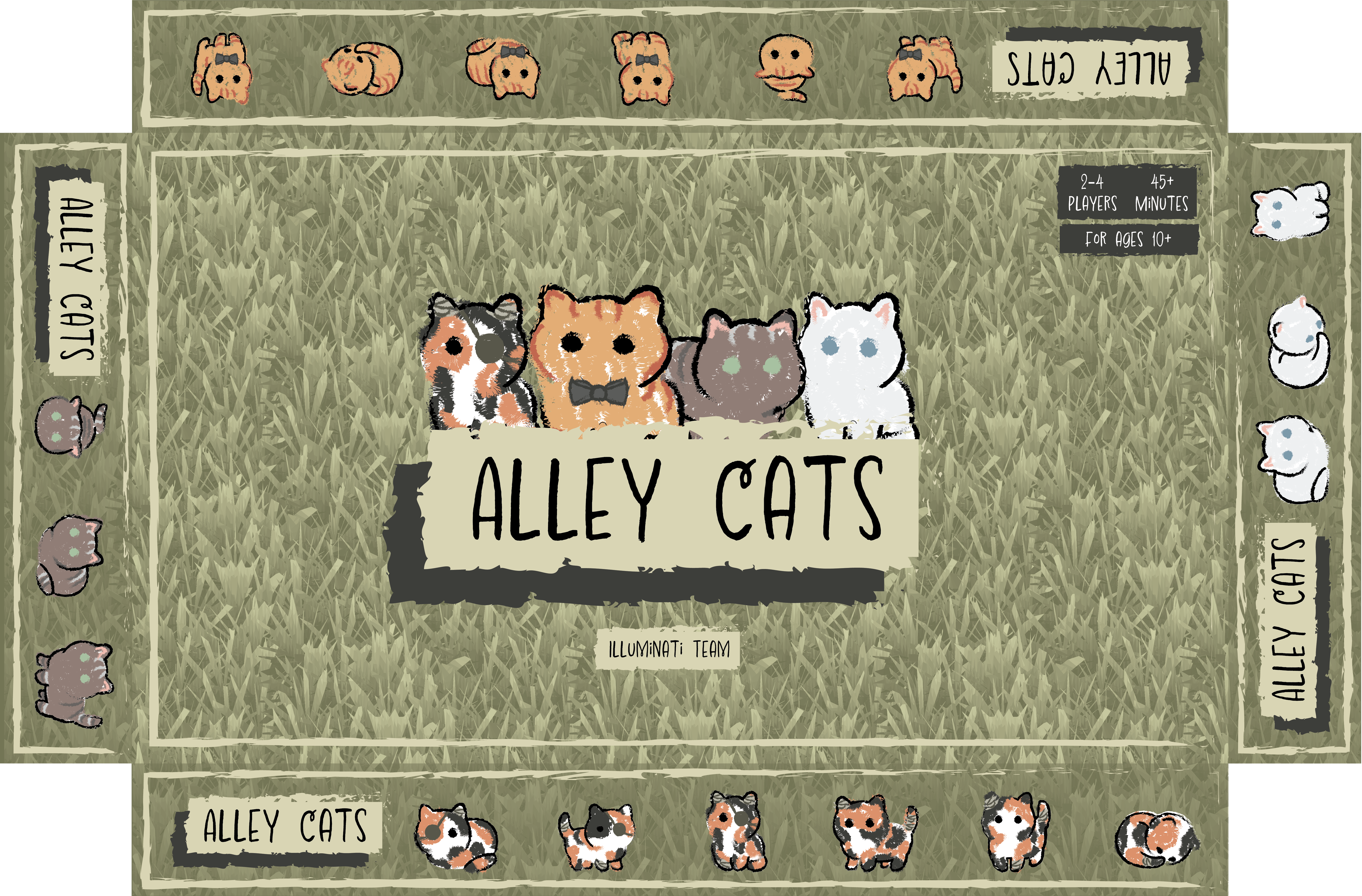 This project showcases the beta development of Alley Cats, a four-player asymmetric board game where feline factions battle for control of the city streets. Building upon the alpha version, the beta phase focused on refining the in-game economy, improving mechanics, and creating a more immersive and visually cohesive experience. I led the graphic design and visual development process using Adobe Illustrator and Photoshop, producing the board layout, card deck, box art, tokens, and rulebook design. The board underwent a full redesign, transitioning from an uneven rectangular layout to a balanced square grid that enhanced symmetry and player navigation. Visual consistency was achieved through a unified color palette and accessible iconography, ensuring clarity and aesthetic harmony. Playtesting sessions guided iterative improvements, emphasizing readability, usability, and thematic alignment. Through this project, I strengthened my skills in design iteration, visual communication, and user experience for tabletop media—balancing strategic gameplay with cohesive storytelling and engaging visual design.